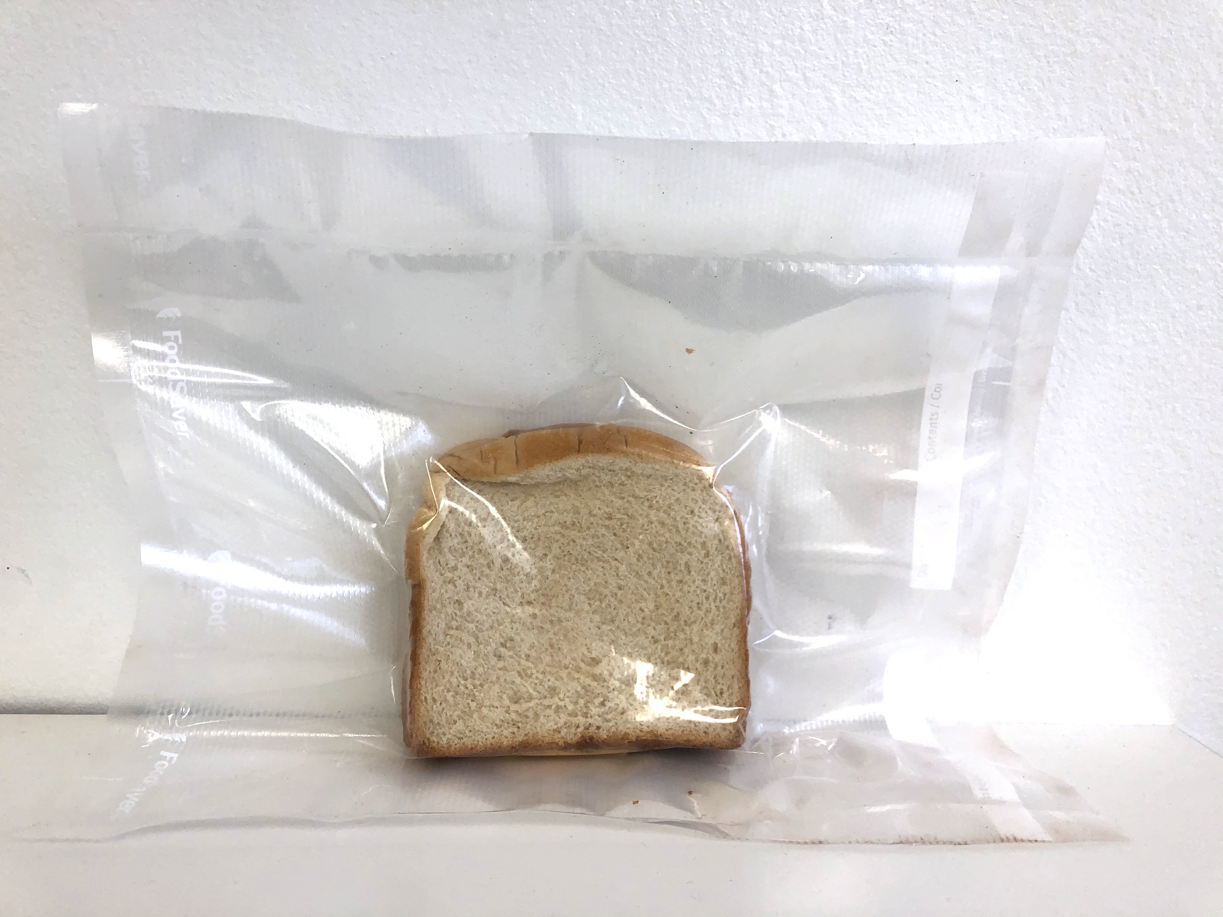 Oscar Mayer bologna sandwich, Roman Meal wheat bread, mayonaise, Kraft cheese slice, Foodsaver bag